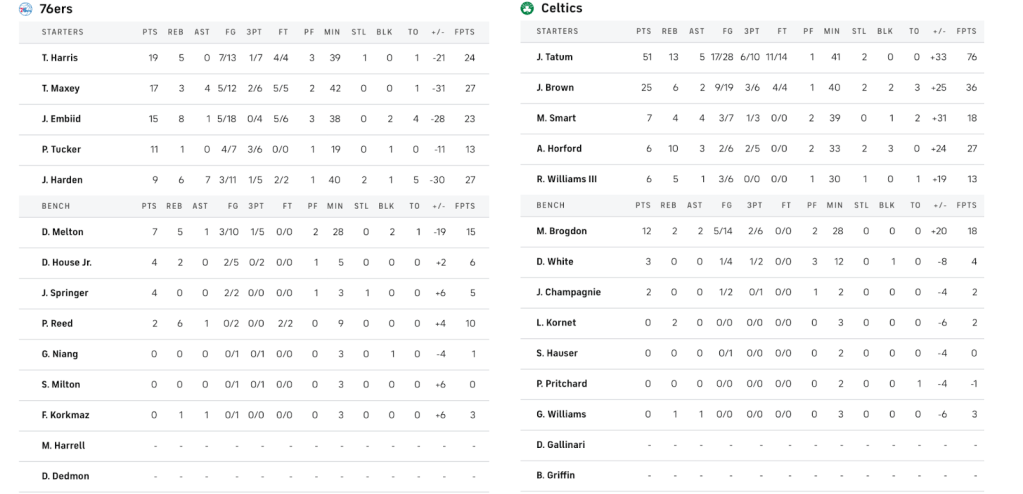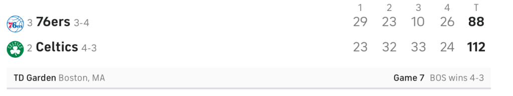 Right from the jump ball at the start of the game, the Celtics and 76ers went back and forth, with the score being 29-23 76ers at the end of the first, and 52-55 Celtics during halftime. The stars of the game for the 76ers were Power Forward Tobias Harris scoring 19 points, point guard Tyrese Maxey, and Center Joel Embiid who had 15 points and 8 rebounds for the night. For the Celtics, the stars of the show were power forward Jayson Tatum with 51 points, small forward Jaylen Brown with 25 points, and center Al Horford with 6 points and 10 rebounds. The Celtics are now going to play the Miami Heat in the Conference final series starting Wednesday May 17th at 8:30pm.