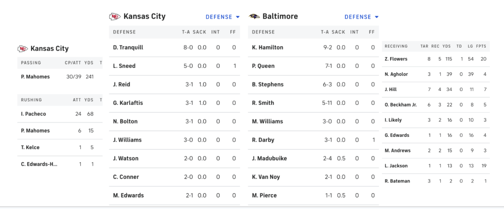 – Lamar Jackson (BAL): Despite facing relentless pressure from the Chiefs’ defense, Jackson exhibited an outburst of brilliance, throwing for 272 yards and a touchdown, but was ultimately unable to overcome the intimidating Kansas City unit.