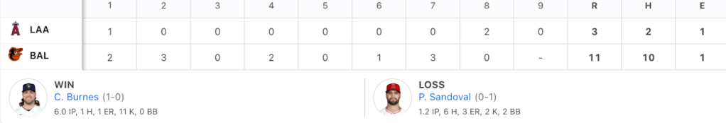 Shortly after with 2 outs in the first, Mike Trout would hit a Solo Homerun on a 1-1 slider. Giving the Angels their only lead of the game. In the Bottom of the 2nd inning, Adley Rutschman would single up the middle scoring 2. During the top of the 6th Corbin Burnes would end the frame with his 11th strikeout.